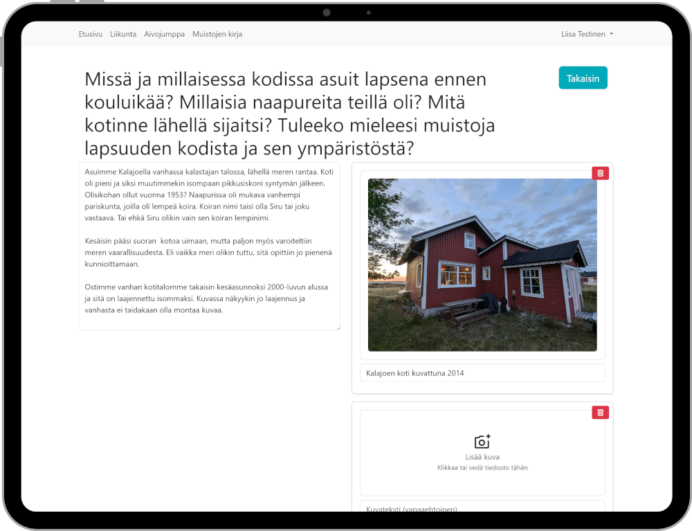 - Muistojen kirjaan voi liittää tekstiä ja kuvia omasta nuoruudestaan ja itselle tärkeistä asioistaan